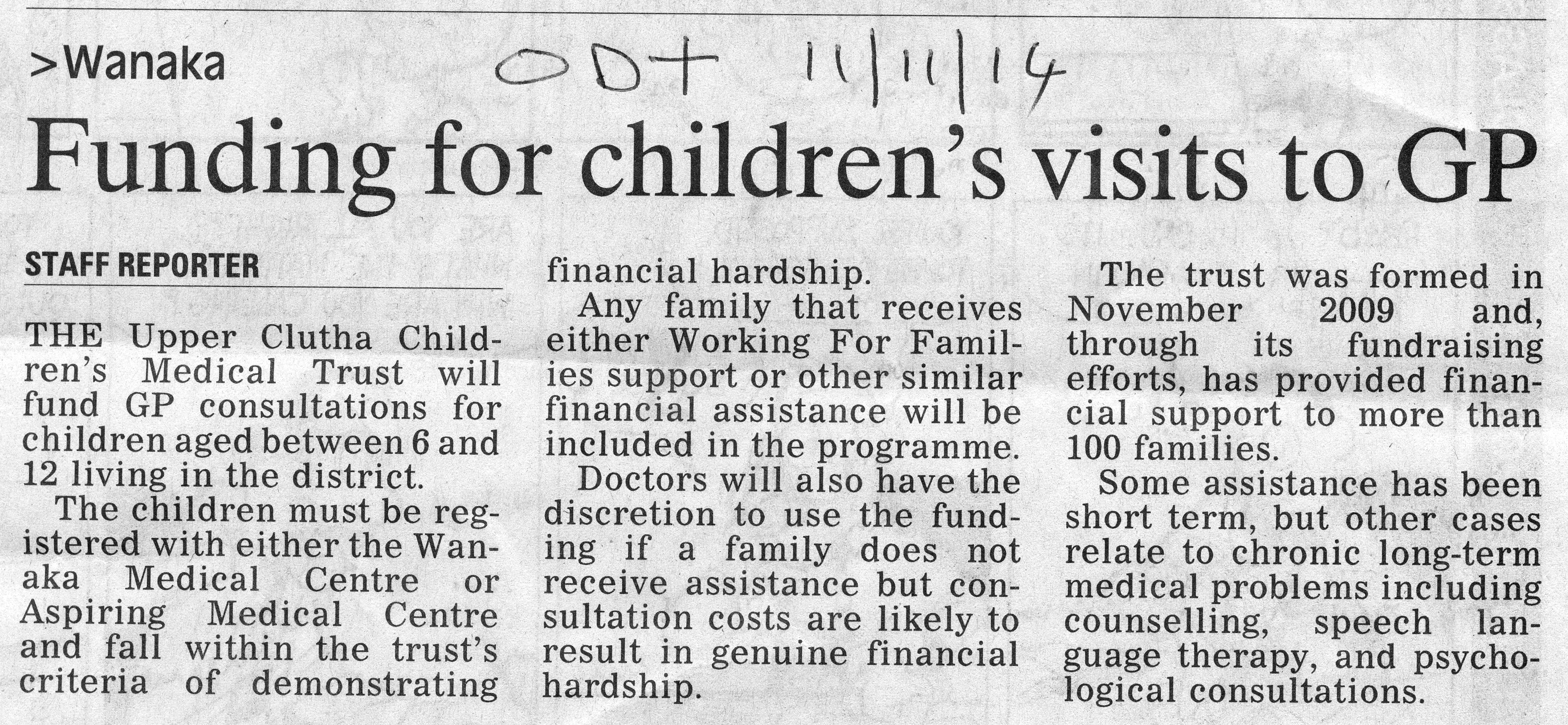 An Otago Daily Times story on the Free Doctor's Visits paid for by the Trust