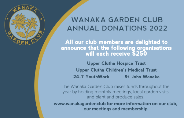 We are delighted to have received a $250 donation from the Wanaka Garden Club’s Annual Donations 2022. The club raises these funds through meetings, garden visits, plant and produce sales. Such a lot of work for club members so we are extra grateful to be the recipient of some of this years funds. Thank you Wanaka Garden Club!